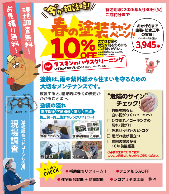元請け会社として、相談から見積もり・契約・施工・工事完了・アフターメンテナンスまで全責任を持って対応しますのでご安心ください。