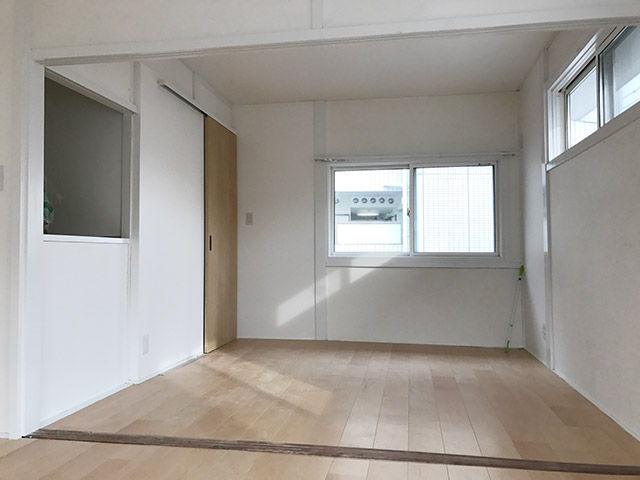 明るく広々とした空間をつくりたいとのご要望をいただきました。広々とした空間にするために構造補強を行い、20帖のリビングをつくりました。部屋を明るくするため、光の反射を考慮してリビングの壁をしっくいで仕上げました。